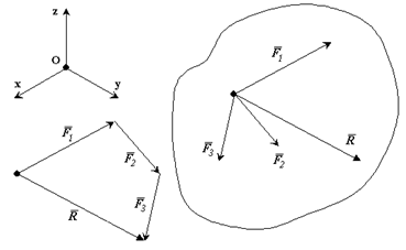 Равнодействующая системы сходящихся сил равна векторной сумме слагаемых сил и определяется замыкающей стороной силового многоугольника, построенного на слагаемых силах как на составляющих. Точка приложения равнодействующей силы совпадает с точкой пересечения линий действия сил.