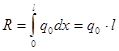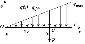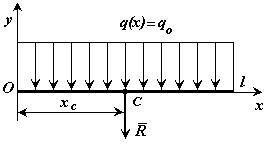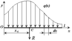 Распределенная по отрезку прямой сила интенсивности  q(x)  эквивалентна сосредоточенной силе  .  Сосредоточенная сила прикладывается в точке  С  (центре параллельных сил)  с координатой