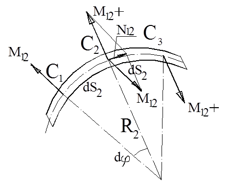Рассмотрим сечение оболочки «с торца», в котором точки С1, С2, С3 находятся на расстояниях dS2 друг от друга. На участке С1 С2 действует крутящий момент  М12, на участке С2 С3 момент М12 + ∂М12/∂s2×ds2. И тот, и другой моменты представим парами сил, приложенных к соответствующим участкам оболочки.