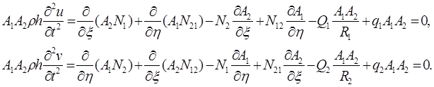 Уравнения движения получаются в соответствии с принципом Даламбера добавлением к уравнениям равновесия инерционных членов. Для соотношений теории оболочек Кирхгоффа-Лява эти уравнения в проекциях на оси ξ, η и z имеют вид