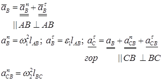 Для определения ускорений точек В и С записываем уравнения в следующем виде: