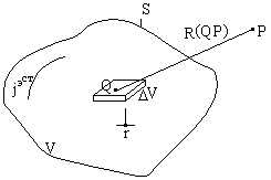 Требуется определить поле в искомой точке Р вне объема V, причем расстояние от любой точки внутри объема до точки Р значительно больше, чем размеры объема. Выделим внутри объема V точку Q и вокруг нее построим элементарный объем DV. R — расстояние между точками Q и Р. Мы ищем интенсивность поля