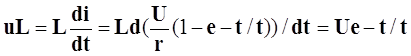 Рассмотрим включение источника постоянного напряжения u(t)=U в цепь последовательно соединенных r, L элементов (рис 5.1). Для послекоммутационного периода (t>0 и t=0), применив закон Кирхгофа, получим: