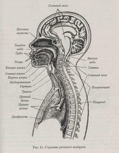Функция голосо- и речеобразования тесно связана с дыхательной функцией, а периферические органы речи являются в то же время и дыхательными органами. В состав периферического речевого аппарата входят: нос, рот, глотка, гортань, трахея, бронхи, легкие, грудная клетка и диафрагма (рис. 41).
