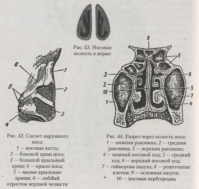 Наружная, или боковая, стенка полости носа по своему строению наиболее сложная. На ней имеются три горизонтально расположенных костных выступа, напоминающих по форме половинку двустворчатой раковины. Это носовые раковины — нижняя, средняя и верхняя. Самая большая из них — нижняя — является самостоятельной костью, а средняя и верхняя представляют собой отростки решетчатой кости. Под носовыми раковинами расположены три носовых хода: между нижней раковиной и дном носовой полости — нижний носовой ход, между средней и нижней раковинами — средний, между верхней и средней раковинами — верхний носовой ход. Щелевидное пространство между носовой перегородкой и обращенными к ней поверхностями всех трех носовых раковин называется общим носовым ходом.