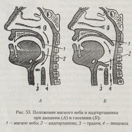 и воздух свободно проходит из носа через глотку в гортань и дыхательное горло (надгортанник в это время приподнят). Во время глотания мягкое небо приподнимается, прикасается к задней стенке глотки и разобщает среднюю часть глотки и носоглотку; надгортанник в это время опускается и прикрывает вход в гортань. Благодаря такому механизму исключается возможность проталкивания пищевого комка в носоглотку и нос, а также попадания пищи в гортань и дыхательное горло.