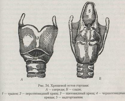 Остов гортани (рис. 54) состоит из девяти хрящей — трех непарных (щитовидный, перстневидный и надгортанник) и трех парных (черпаловидных, санториниевых и врисбергиевых).