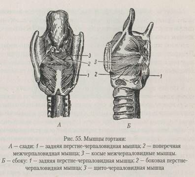 Внутренние мышцы гортани (рис. 55) делятся на три группы: 1) мышцы, натягивающие голосовые связки; 2) мышцы, расширяющие голосовую щель; 3) мышцы, суживающие голосовую щель.