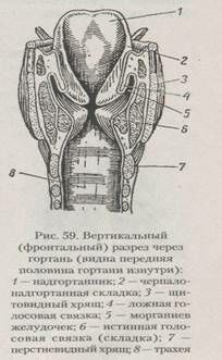 Вся полость гортани выстлана слизистой оболочкой, покрытой мерцательным эпителием (за исключением истинных голосовых связок, которые покрыты плоским эпителием). На боковых стенках гортани слизистая оболочка образует складки, расположенные над истинными голосовыми связками, — это так называемые ложные голосовые связки (рис. 59). Между истинными и ложными связками образуются мешковидные углубления, называемые морганиевыми желудочками. Между черпаловидными хрящами и краями надгортанника также образуются складки слизистой оболочки — черпалонад-гортанниковые складки, в толще которых заложены врисбергиевы хрящи.