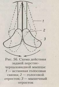 В группу мышц, расширяющих голосовую щель, входит только одна мышца — задняя перстне-черпаловидная, называемая для краткости просто задняя мышца. Она начинается на задней поверхности печатки перстневидного хряща и прикрепляется к мышечному отростку черпаловидного. При своем сокращении она поворачива-. ет черпаловидные хрящи вокруг вертикальной оси, вследствие чего голосовые отростки этих хрящей вместе с прикрепленными к ним задними концами истинных голосовых связок расходятся в стороны и раскрывают голосовую щель.