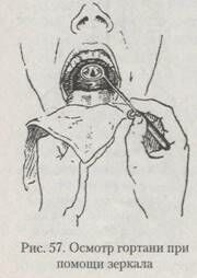 Движения голосовых связок можно наблюдать, пользуясь гортанным (ларингоскопическим) зеркалом, представляющим собой круглое зеркальце, укрепленное на ручке под углом 45°. Слегка нагретое зеркальце прикладывают тыльной стороной к мягкому небу, отодвигая его назад, при вытянутом вперед языке (рис. 57).