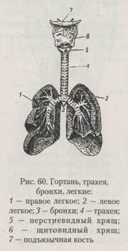 На уровне 5-го грудного позвонка трахея делится на две трубки — первичные, или главные, бронхи. Бронхи имеют такое же строение, как трахея, только хрящи не так правильны по форме и меньше по размерам. Первичные бронхи направляются к легким и делятся на вторичные бронхи. Правый бронх делится на три ветви, левый — на две, соответственно числу долей легкого. Каждый из вторичных бронхов, войдя в легкое, начинает древовидно разветвляться, образуя третичные бронхи, а затем — более мелкие веточки. Стенки мелких бронхов также состоят из хрящей и мышечных волокон. Трахея и бронхи выстланы слизистой оболочкой, покрытой мерцательным эпителием. В самых мелких бронхиальных веточках, называемых бронхиолями, эпителий плоский. Конечные разветвления бронхов переходят в альвеолярные ходы, окруженные легочными пузырьками — альвеолами. Стенки альвеол состоят из упругой эластической ткани; в них заложена густая сеть кровеносных сосудов (легочных капилляров). Здесь вдыхаемый воздух отдает в кровь свой кислород и получает из крови углекислоту.