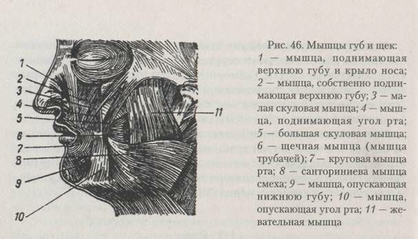 Кроме круговой мышцы рта, которая расположена в толще губ и при своем сокращении прижимает губы друг к другу, вокруг ротового отверстия расположены многочисленные мышцы, обеспечивающие разнообразные движения губ (рис. 46). К верхней губе относятся: мышца, поднимающая верхнюю губу, малая скуловая мышца, большая скуловая мышца, санториниева мышца смеха, мышца, поднимающая угол рта. К нижней губе относятся: мышца, опускающая нижнюю губу, и мышца, опускающая угол рта.