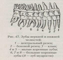 Зубы располагаются в виде двух дуг (верхней и нижней) и укреплены в альвеолах (ячейках) верхней и нижней челюстей (рис. 47).