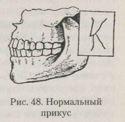 Зубы впервые появляются на 6— 8-м месяце после рождения. Это так называемые временные, или молочные, зубы. Прорезывание молочных зубов заканчивается к 2,5—3 годам. К этому времени их оказывается 20: по 10 в каждой челюстной дуге (4 резца, 2 клыка, 4 малых коренных зуба). Смена молочных зубов на постоянные начинается на 7-м году и заканчивается к 13—14 годам, за исключением последних коренных зубов, так называемых зубов мудрости, которые прорезываются на 18—20-м году, а иногда и позже. Постоянных зубов — 32 (по 16 зубов в каждой челюстной дуге, в том числе 4 резца, 2 клыка, 4 малых коренных и 6 больших коренных). Взаиморасположение верхнего и нижнего зубных рядов при сомкнутых челюстях называют прикусом. При нормальном строении челюстей и зубной системы верхняя зубная дуга несколько больше нижней, так что при смыкании челюстей нижние передние зубы слегка прикрываются верхними, причем все зубы верхнего ряда соприкасаются со всеми зубами нижнего ряда. Такой прикус считается нормальным (рис45).