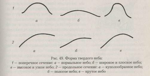 варьирует. В поперечном сечении он может быть более высоким и узким или более плоским и широким; в продольном направлении небный свод может быть куполообразным, пологим или крутым (рис. 49).