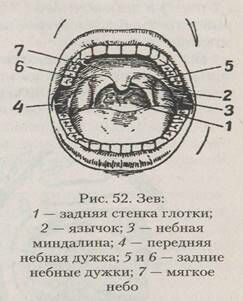 Средняя (ротовая) часть глотки, или ротоглотка, служит продолжением носоглотки книзу. Нижней ее границей является горизонтальная плоскость, проходящая через корень языка. Заднюю стенку образует позвоночник. Спереди средняя часть глотки сообщается с полостью рта посредством широкого отверстия, называемого зевом (рис. 52).
