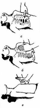 •обеспечить проходимость верхних дыхательных путей; осуществляется указательным и средним пальцами, которые нужно обернуть чистым носовым платком или марлей; быстро очистить ротовую полость от инородных тел, крови, слизи; затем немного запрокинуть голову пострадавшего назад, подложив под его плечи небольшой плотный валик, сделанный из любого подручного материала;