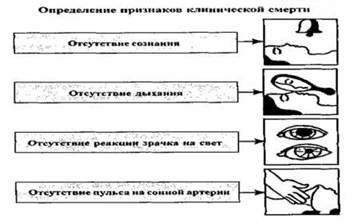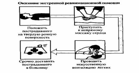 При наличии признаков клинической смерти, отсутствии дыхания и прекращении сердечной деятельности проводится реанимация, т.е. восстановление жизненно важных функций организма. Если реанимация начата в первую минуту, вероятность оживления составляет более 90 %, через 3 мин - не более 50 %. Реанимационные мероприятия проводятся на месте происшествия, сразу же после травмы, в последовательности, указанной на схеме.