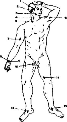 Точки прижатия артерий: I — височная; 2 — затылочная; 3 — челюстная; 4 — сонная; 5 — подключичная; 6 — подмышечная; 7 — плечевая; 8 — лучевая; 9 — локтевая; 10,11 — бедренная; 12, 13 — большеберцовая.