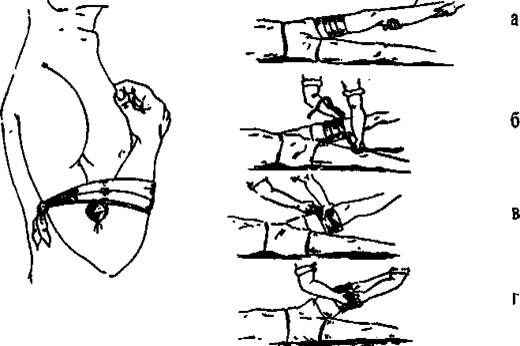 Временная остановка кровотечения путем путем максимального сгибания конечности и путем наложения резинового гемостатического жгута Эсмарха.: а — обертывание конечности полотенцем, б — жгут подведен под бедро и растянут; в — первый оборот жгута; г — закрепление жгута.