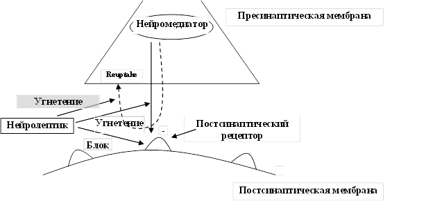 - Блокировать постсинаптические, главным образом, дофаминовые рецепторы, а также (в меньшей степени) a-адренорецепторы, м-холинорецепторы и Н1-гистаминовые рецепторы.