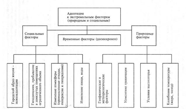 Жизнь современного человека весьма мобильна, и в обычных естественных условиях его организм непрерывно адаптируется к целому комплексу природно-климатических и социально-производственных факторов (рис. 13). «Цена адаптации» зависит от дозы воздействующего фактора и индивидуальных особенностей организма. Доза воздействия и переносимость зависят от наследственных — генетических — особенностей организма, продолжительности и силы (интенсивности) воздействия факторов.