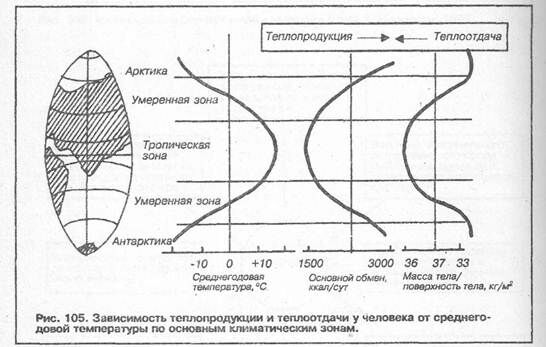 Процесс адаптации при перемещении в южные широты имеет больше специфики. При постоянном действии высокой температуры (в зависимости от влажности) главные изменения в организме — дегидратация и потеря солей, в частности ЫаС1. Соответственно процесс адаптации идет в направлении повышения выработки АДГ и альдостерона. В результате устанавливается экономичное выделение этих гормонов, позволяющее снизить потерю воды и ИаС1 и в то же время сохранить механизм потоотделения как основу для повышенной отдачи тепла. В этих условиях активно функционирует гипоталамический центр терморегуляции, которому принадлежит роль в управлении теплопродукцией и теплоотдачей.