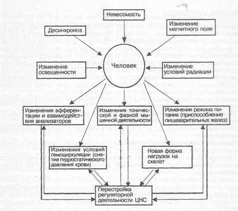 Рис. 106. Факторы, действующие на организм в условиях космического полета, и изменения в различных системах организма.