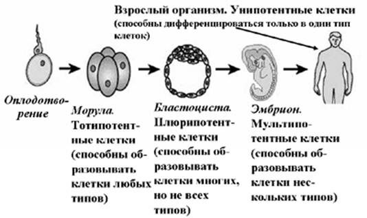 Способность стволовых клеток к большей или меньшей (по «широте») дифференцировке меняется по мере роста и развития эмбриона. Так стволовые клетки морулы (тотипотентные стволовые клетки) способны образовывать клетки любых типов, стволовые клетки бластоцисты (бластомеры, плюрипотентные стволовые клетки) способны образовывать клетки многих, но не всех типов, стволовые клетки эмбриона, находящегося на стадии развития более поздней, чем бластоциста (мультипотентные стволовые клетки), способны образовывать клетки нескольких определенных типов. Стволовые клетки взрослого организма унипотентны, то есть, способны образовывать клетки только определенных тканей (крови, нервной системы и т.п.). Однако, в последнее время в научной печати стали появляться сообщения о так называемой «направленной дифференцировке» стволовых клеток взрослого организма. Так, якобы, из взрослых стволовых клеток костного мозга удалось в результате генетического перепрограммирования получать нервные и мышечные клетки. Эти сообщения требуют тщательной проверки. О некоторых результатах направленной дифференцировки взрослых стволовых клеток будет сказано в дальнейшем.