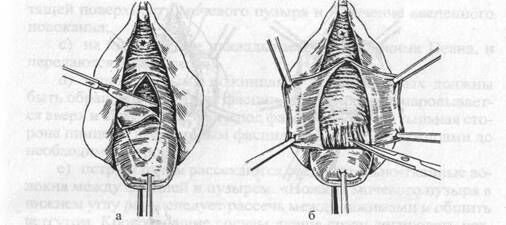 Разрез должен начинаться в 2 см от наружного отверстия мочеиспускательного канала и завершаться в 1,5-2 см от нижнего края шейки матки. Необходимо помнить, что только при рассечении тканей брюшком скальпеля имеется возможность контролировать глубину разреза. Нельзя производить разрез кончиком инструмента из-за опасности ранения мочевого пузыря. При правильно выполненном разрезе края раны в результате сокращения мышц влагалищной трубки должны разойтись на 5-8 мм.