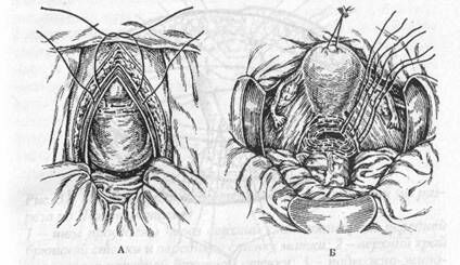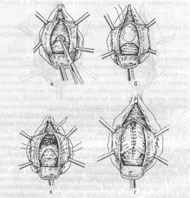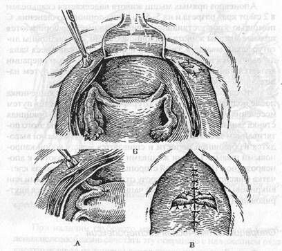 Апоневроз прямых мышц живота надсекается скальпелем в 2 см от края разреза и на 5-6 см выше лонного сочленения. С помощью кровоостанавливающего зажима перфорируются прямые мышцы живота и брюшина с обеих сторон. Концы лигатур захватываются зажимами и через образовавшиеся каналы выводятся над апоневрозом. Следующим этапом операции является ушивание пузырно-маточного углубления путем наложения 2-3 капроновых швов.