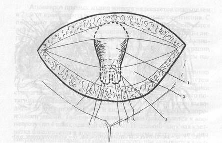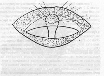 Рис. 30. Схема истмической гистеропексии из разрезано Пфан-ненштилю в модификации Н. П. Романовской 1 — тело матки; 2 — нижний край апоневроза передней брюшной стенки; 3 — швы в области перешейка матки