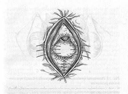 Важным является правильное соединение гименальной складки, что обеспечивает симметрию наружных половых органов. Кожа промежности сшивается 2-3 капроновыми швами, но можно использовать внутри кожный викриловый шов. Влагалище обрабатывается йодонатом и заполняется на сутки стерильным марлевым тампоном, смоченным вазелиновым маслом.