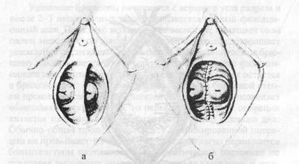 Передняя брюшная стенка ушивается по общепринятой методике. Куполообразная форма апоневротическо-мышечно-го лоскута облегчает на завершающем этапе операции ушивание апоневроза. При возникновении трудности стягивания краев апоневроза на последний могут быть нанесены продольные насечки дойной 1-1,5 см на расстоянии 2 см от края апоневроза.