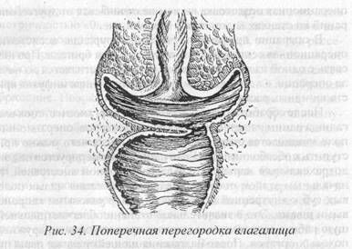 Поперечная перегородка влагалища чаще всего располагается на границе нижней и средней трети органа. Наличие перегородки препятствует нормальной половой жизни и оттоку менструальной крови. При полной поперечной перегородке может возникнуть гематокольпос, гематометра и даже гематосаль-пинкс. Иссечение перегородки осуществляется циркулярным разрезом по нижнему краю ее. Облегчение проведения операции может быть достигнуто предварительным рассечением перегородки на 14, 16, 20 и 22 часах (по циферблату). По мере иссечения перегородки накладываются восьмиобразные кетгу-товые швы. Возможным осложнением после этой операции может быть стенозирующее рубцевание. В целях профилактики этого осложнения рекомендуется начать регулярную половую жизнь через две недели после операции.