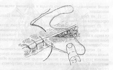d) тупоконечными ножницами, концы которых должны быть обращены в сторону фасции, последняя отсепаровывает-ся вверх и вниз. После этого под фасцию вводится тыльная сторона пинцета, над которым фасция рассекается ножницами до необходимого уровня;