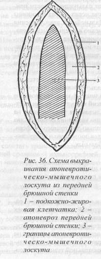 3 см в стороны от средней линии. Ассистент разводит края раны крючками Фарабефа, а хирург тем временем выкраивает апоневроти-ческо-мышечный лоскут куполообразной формы, обращенный вер-шиной в сторону пупка. Длина лоскута должна быть не менее 8 см при ширине 2 см. Вершина выкроенного лоскута захватывается зажимом Кохера и оттягивается в сторону лонного сочленения. Апоневроз белой линии живота с тонким слоем прямых и пирамидальных мышц подсекается скальпелем. Кровоточащие сосуды мышц сразу же обшиваются тонким кетгутом. Выделенный лоскут окутывается марлевой салфеткой, смоченной в физиологическом растворе натрия хлорида, и укладывается на отгораживающее белье на лонном сочленении. Дальнейшее вхождение в брюшную полость осуществляется стандартно. Рана обшивается влажными марлевыми салфетками.