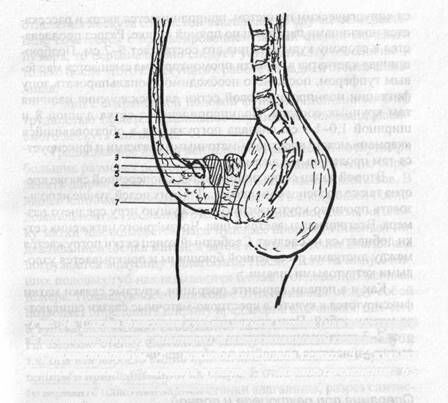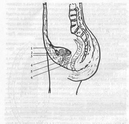 1 — апоневротическо-мышечный лоскут; 2 — лонное сочленение; 3-мочевой пузырь; 4 — культя шейки матки; 5 — влагалище; 6 — прямая кишка