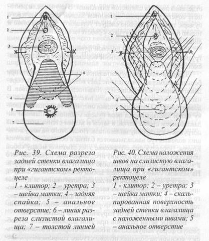Хирургическая коррекция данной патологии представляет большие трудности из-за резкого истончения ректовагиналь-ной перегородки и опасности ранения прямой кишки во время отделения лоскута слизистой влагалища. В случае если ректоцеле сочетается с пролабированием задней стенки мочевого пузыря, то первоначально следует устранить эту патологию и только после этого приступать к работе на задней стенке влагалища.