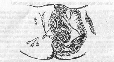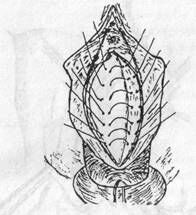 Боковые ветви разрезов при этом должны иметь дугообразную форму выпуклостью в боковые стороны и заканчиваться у зажимов на больших половых губах. Ширина выкраиваемого лоскута зависит от величины ректоцеле. Отсепаровка лоскута слизистой производится острым путем под контролем пальцев левой руки, помещенных под отслаиваемую слизистую. Отсепаровка всегда должна начинаться сверху. Кровоточащие сосуды следует сразу же обшивать тонким кетгутом или викрил ом. Кожа промежности рассекается разрезом дугообразной формы, обращенным выпуклостью в сторону анального отверстия. Для этого ассистенты растягивают зажимы Кохера в стороны, что обеспечивает возможность выполнения симметричного разреза. После удаления лоскута слизистой оболочки