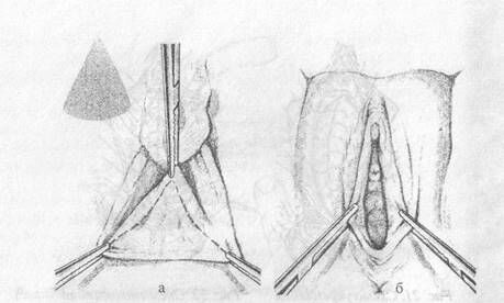 После подготовки операционного поля и проведения проводниковой и инфильтрационной анестезии 0,25% раствором новокаина с адреналином всего Бульварного кольца, малые половые губы фиксируются к внутренней поверхности бедер узловыми швами. Шейка матки обнажается зеркалами Симпса, после чего на ее переднюю губу накладывается пара пулевых щипцов. Плавным потягиванием за них шейка матки максимально низводится вниз. Проводится повторная обработка стенок влагалища йодонатом, после чего можно приступить к выкраиванию лоскута слизистой из передней стенки. Ширина лоскута определяется степенью выраженности патологического процесса, возрастом пациентки и состоянием ее половой функции.