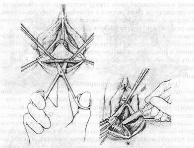 В первом варианте она может быть начата от вершины лоскута слизистой. Для этого края слизистой удаляемого лоскута захватывается двумя зажимами Пеана и слегка потягивается вниз. При этом второй палец левой руки помешается под зажимам и и выдавливает вверх стенку влагалища, что обеспечивает расхождение краев разреза и облегчает работу скальпелем. Соединительно-тканные волокна подсекаются по боковым краям разреза, а по центру лоскута слизистая смещается ребром скальпеля. Натягивающиеся при этом тканевые волокна подсекаются скальпелем в направлении на палец. Необходимо помнить о толщине влагалищно-ректальной перегородки и работать инструментом с максимальной осторожностью. Кровоточащие сосуды лучше сразу лигировать методом обшивания тонким кетгутом.