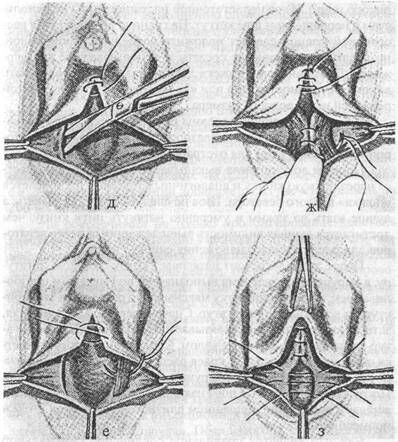д — рассечение фасции промежности; е — начало соединения мышц поднимающих заднепроходное отверстие; ж — швы на т. levator ani и слизистой влагалища; з — заключительный этап операции на тазовом дне