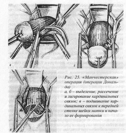 Показанием к ее выполнению служит опущение внутренних половых органов II степени с удлинением шейки матки и частичной несостоятельностью мышц тазового дна. Она может быть выполнена лишь у пациентки завершившей свою репродуктивную функцию или находящейся в постменопаузе. «Манчестерская операция» включает в себя пластику стенок влагалища, высокую ампутацию шейки матки с трансплантацией влагалищных сводов и пластику мышц тазового дна.