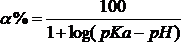 Большинство «нелетучих» ядов, являясь слабыми кислотами или слабыми основаниями, способны существовать в водном растворе в виде ионизированных или неионизированных (молекулярных) форм в зависимости от рН среды. Степень ионизации вещества (слабой кислоты или слабого основания) и необходимое для этого значение рН могут быть определены из уравнения степени ионизации (уравнение Гендерсона):