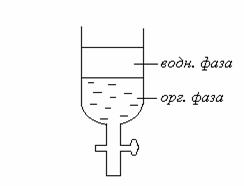 В лабораторных условиях экстракцию обычно проводят с помощью делительной воронки. В воронку помещают исследуемый раствор, содержащий растворенное вещество, подлежащее экстрагированию, и не смешивающийся с водой органический растворитель, которым извлекается экстрагируемое вещество из водного раствора. Воронка энергично встряхивается (обычно 2-5 мин). При этом обе жидкие фазы диспергируются друг в друга, образуя капли различного размера. Экстрагируемое вещество через границу раздела водной и органической фаз переходит из водной фазы в органическую до тех пор, пока в системе не наступит межфазное равновесие, при котором достигаются равновесные концентрации экстрагируемого вещества в водной и в органической фазах. При достижении межфазного равновесия скорость перехода растворенного вещества из водной фазы в органическую становится равной скорости перехода того же вещества из органической фазы в водную, т.е. осуществляется состояние динамического равновесия. После прекращения встряхивания обе жидкие фазы расслаиваются, причем тем быстрее, чем больше разница в плотности воды (водного раствора) и применяемого органического растворителя, плотность которого может быть как выше, так и ниже плотности воды.