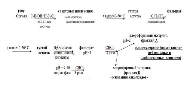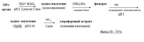 Кислая реакция среды (рН = 2) приводит, кроме того, к разрушению комплексов алкалоидов с белками, в виде которых они находятся в биологическом материале, что увеличивает выход алкалоидов. Влияние рН на эффективность изолирования «нелетучих» ядов особенно выражено при использовании в качестве экстрагента воды, т.к. этанол в большинстве случаев является хорошим растворителем и для ионизированной, и для молекулярной форм кислот и оснований.