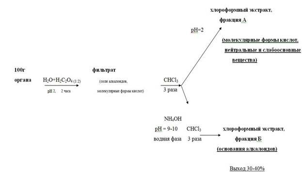 Пользуясь различной растворимостью ионизированных и молекулярных форм «нелетучих» ядов в воде и органических растворителях легко сформулировать принцип их изолирования, из биологического материала.