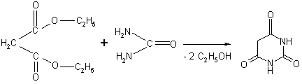 Барбитуровая кислота может быть получена при взаимодействии мочевины и диэтилового эфира малониловой кислоты: